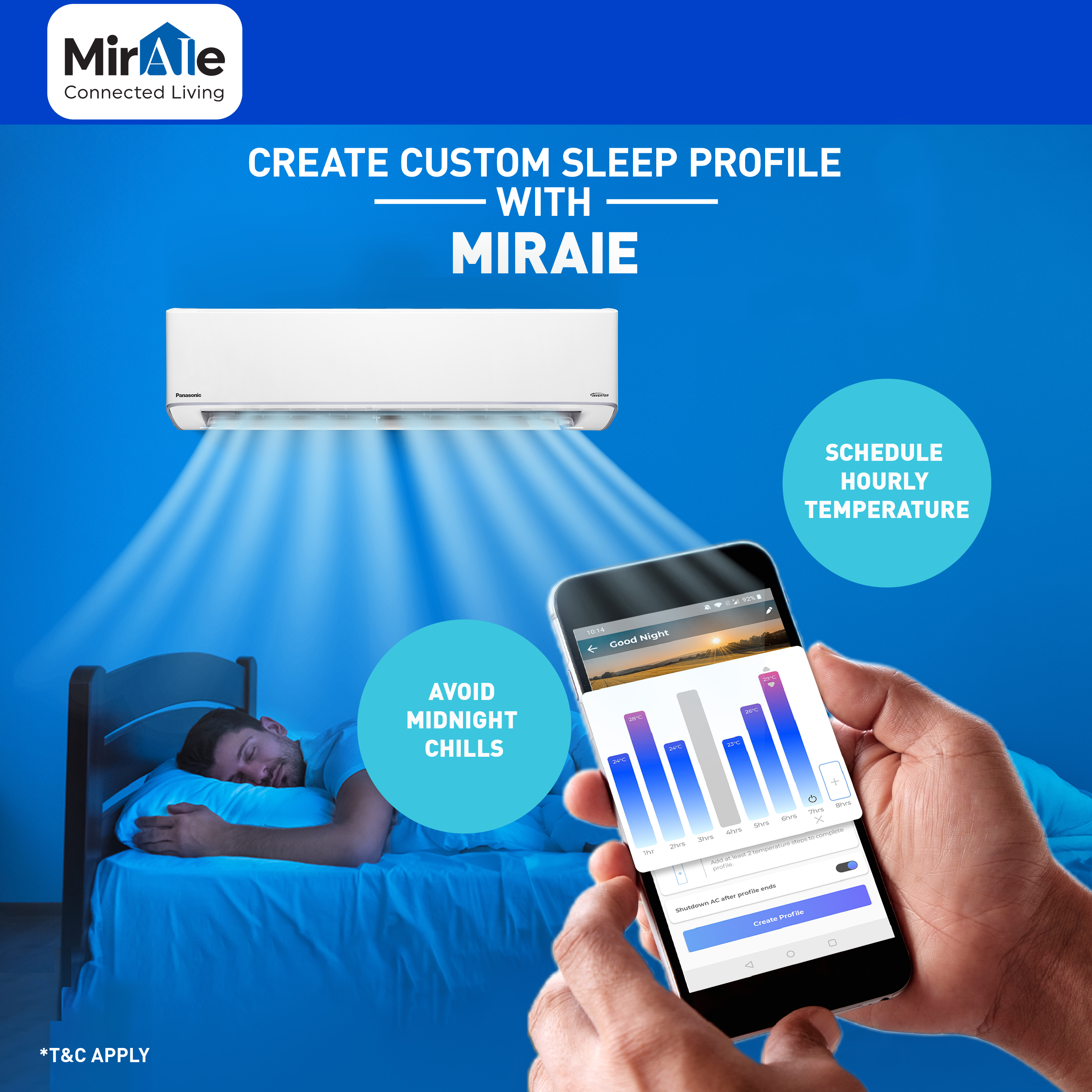 Miraie delivers convenient control, connectivity and comfort. Seamlessly adjust temperature, monitor status and change modes right from the Miraie App. With MirAIe, you can switch your Panasonic Air Conditioner on and off from anywhere, anytime. You can even pre-set the AC temperature as per your sleep profiles. It also notifies you about the indoor pollution level and the need to turn on the Nanoe-G technology. Through MirAIe, call for service is just a touch away.