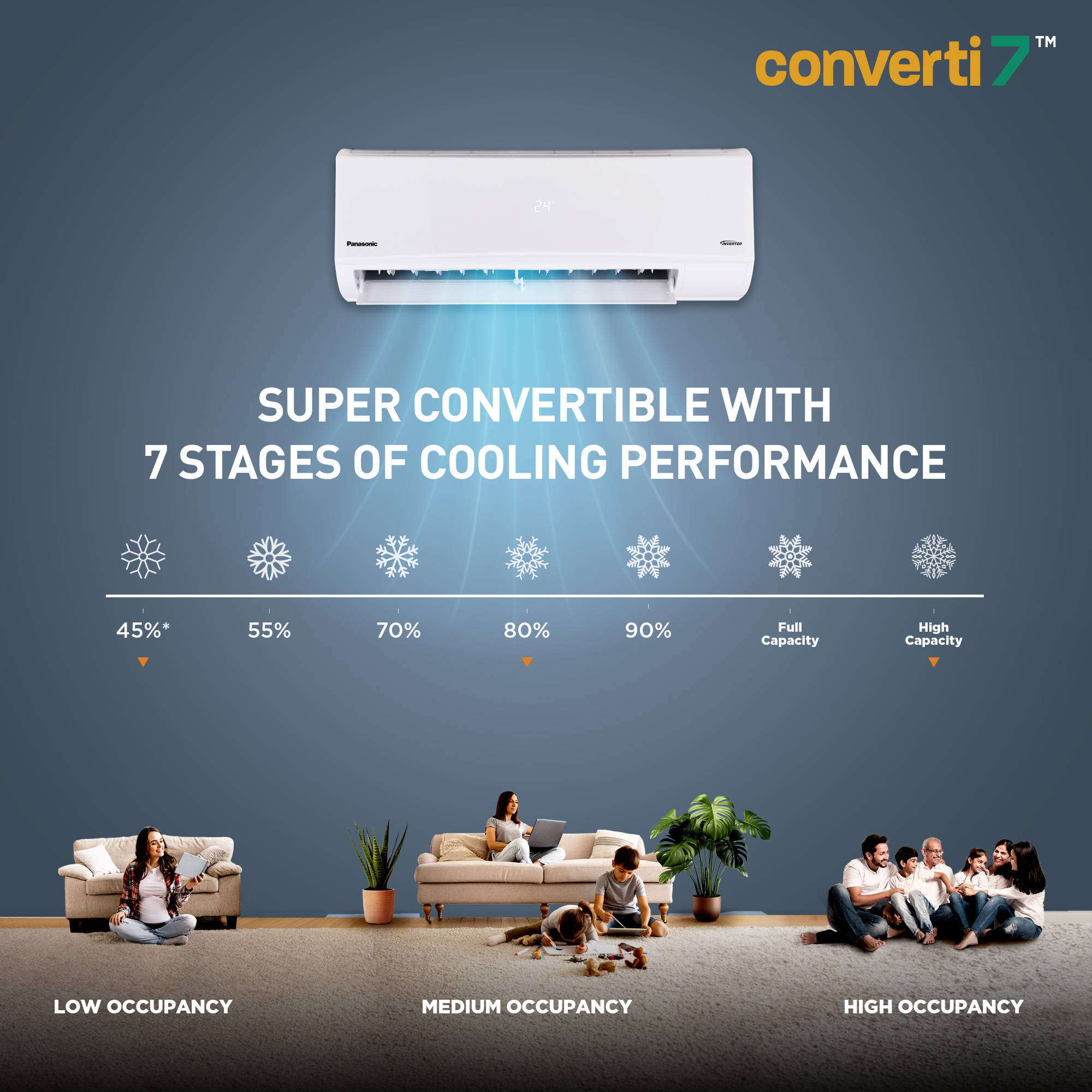 converti7 technology allows user to efficiently and effectively save energy with ability to adjust the AC upto 7 stages of cooling performances, through which users can manually adjust their cooling capacity ranging from 45% to more than 100% via the converti7 button on the remote or through the MirAIe App.