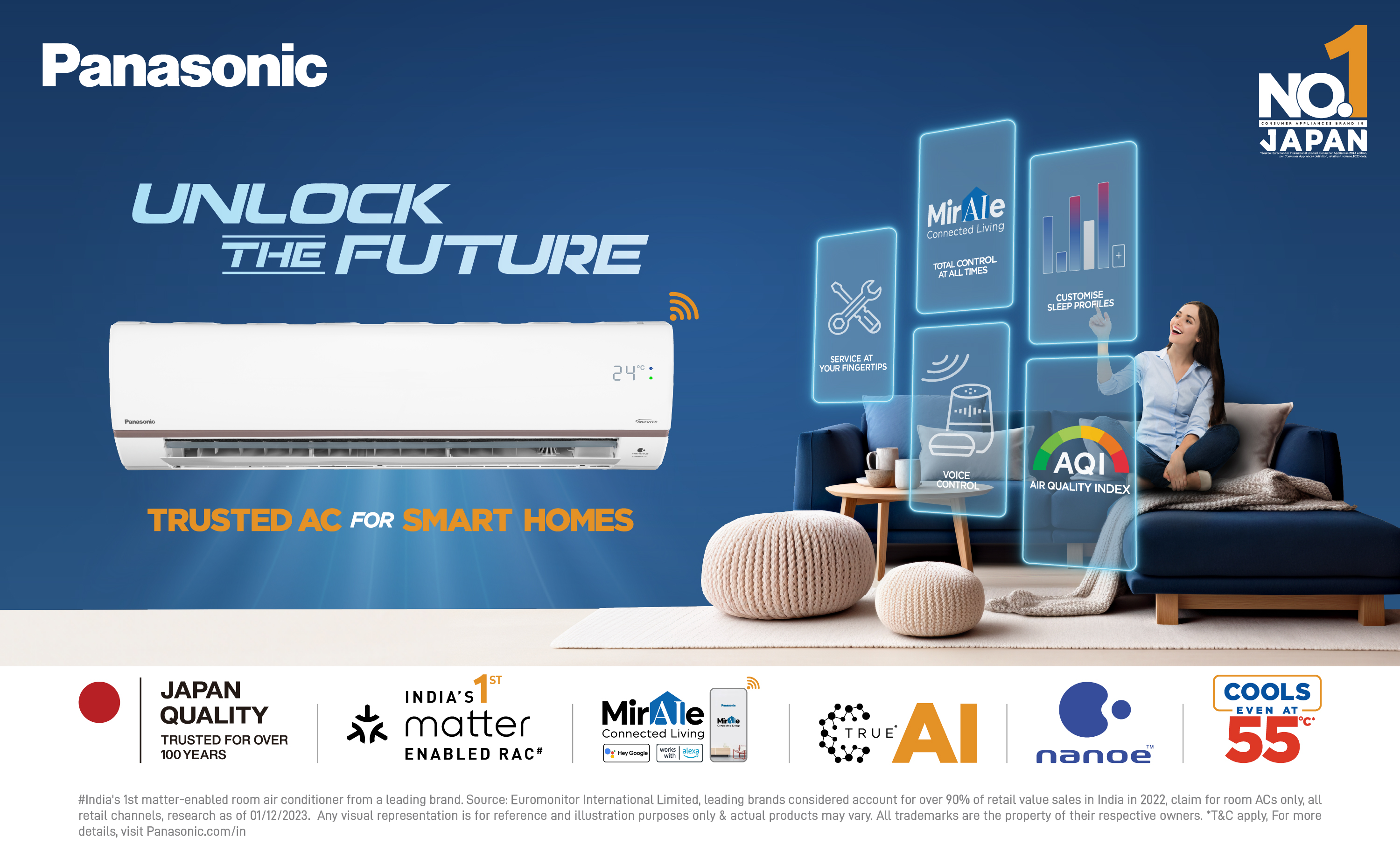 Panasonic unveils the 2025 Premium Smart AC range crafted to suit the needs of a modern day home. With cutting-edge technology, it is designed for reliable performance to bring effortless convenience for a better life. Certified by Euromonitor as India's 1st Matter Enabled Residential Air Conditioners. Unlock the future with Panasonic Air Conditioners to make your home truly smart.