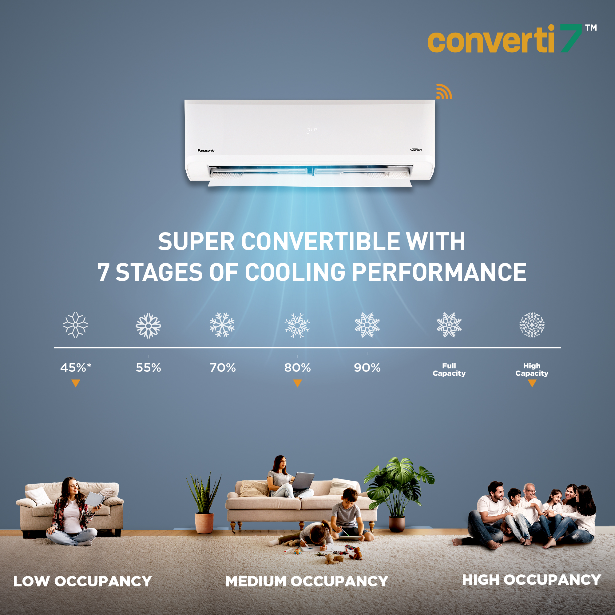 converti7 technology allows user to efficiently and effectively save energy with ability to adjust the AC upto 7 stages of cooling performances, through which users can manually adjust their cooling capacity ranging from 45% to more than 100% via the converti7 button on the remote or through the MirAIe App.
