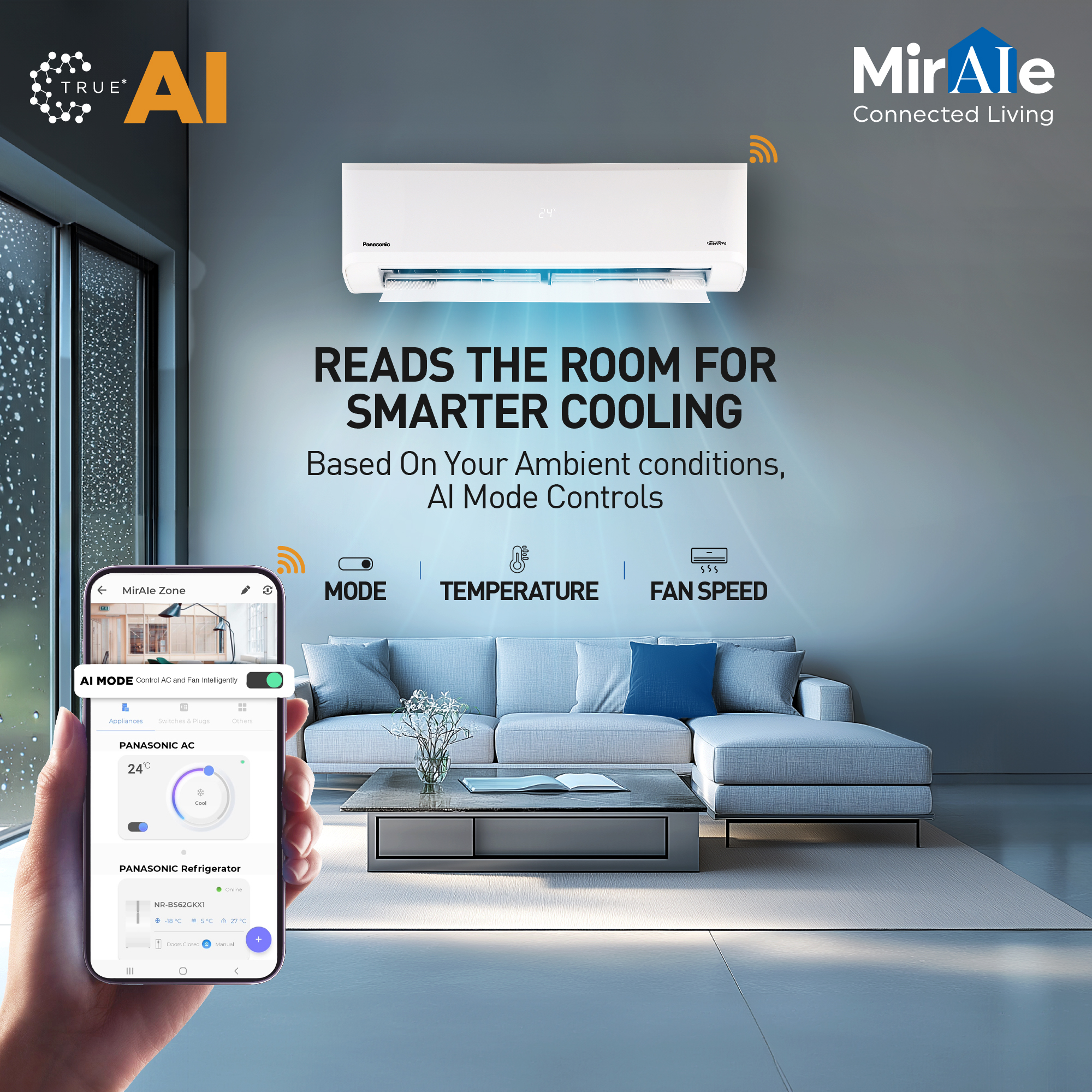 The state-of-the-art True* AI feature of Panasonic Smart AC reads the room and also senses external weather conditions like heat and humidity, while automatically adjusting indoor cooling conditions such as room temperature, cooling mode, and fan speed for an ambient setting.