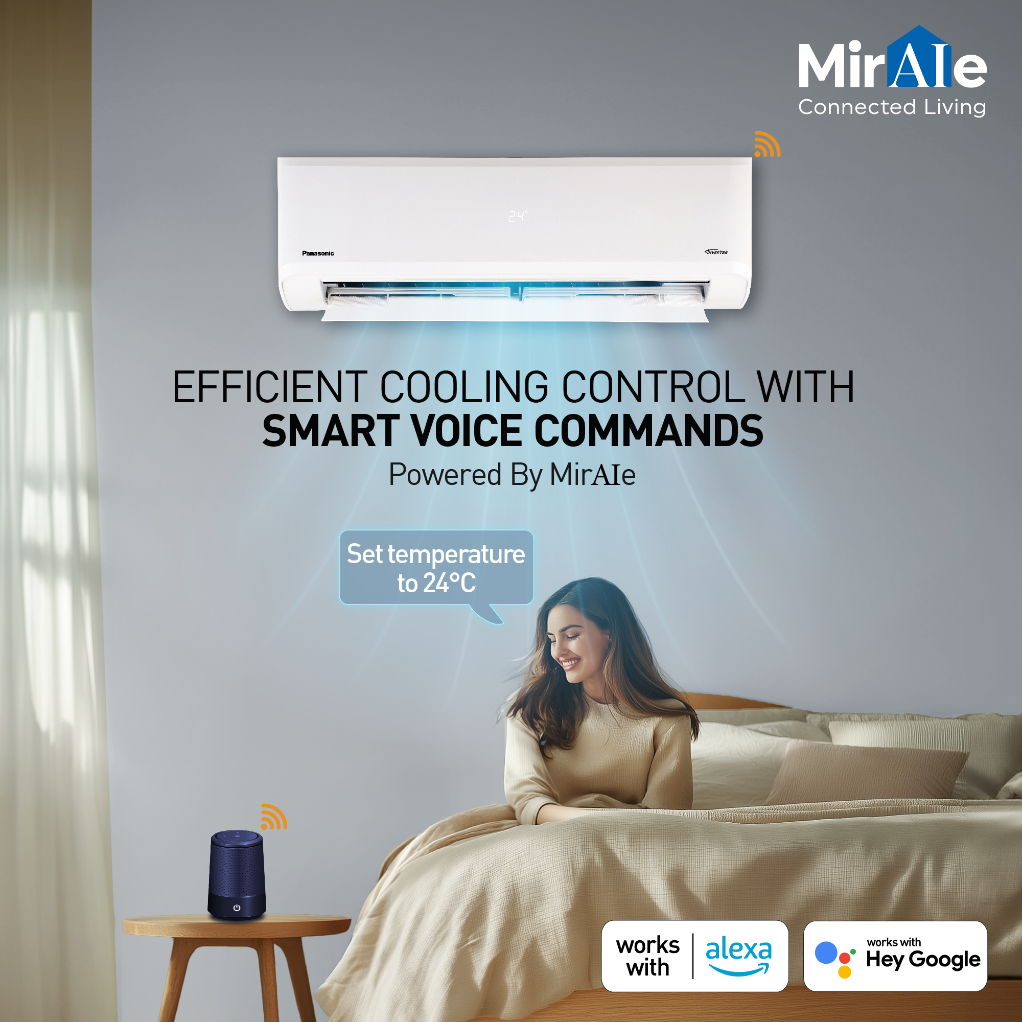 Cooling controls made more efficient with intuitive voice control, powered by MirAIe App. Compatible with both Google Assistant and Amazon Alexa, you can control your Panasonic Smart ACs using voice commands.