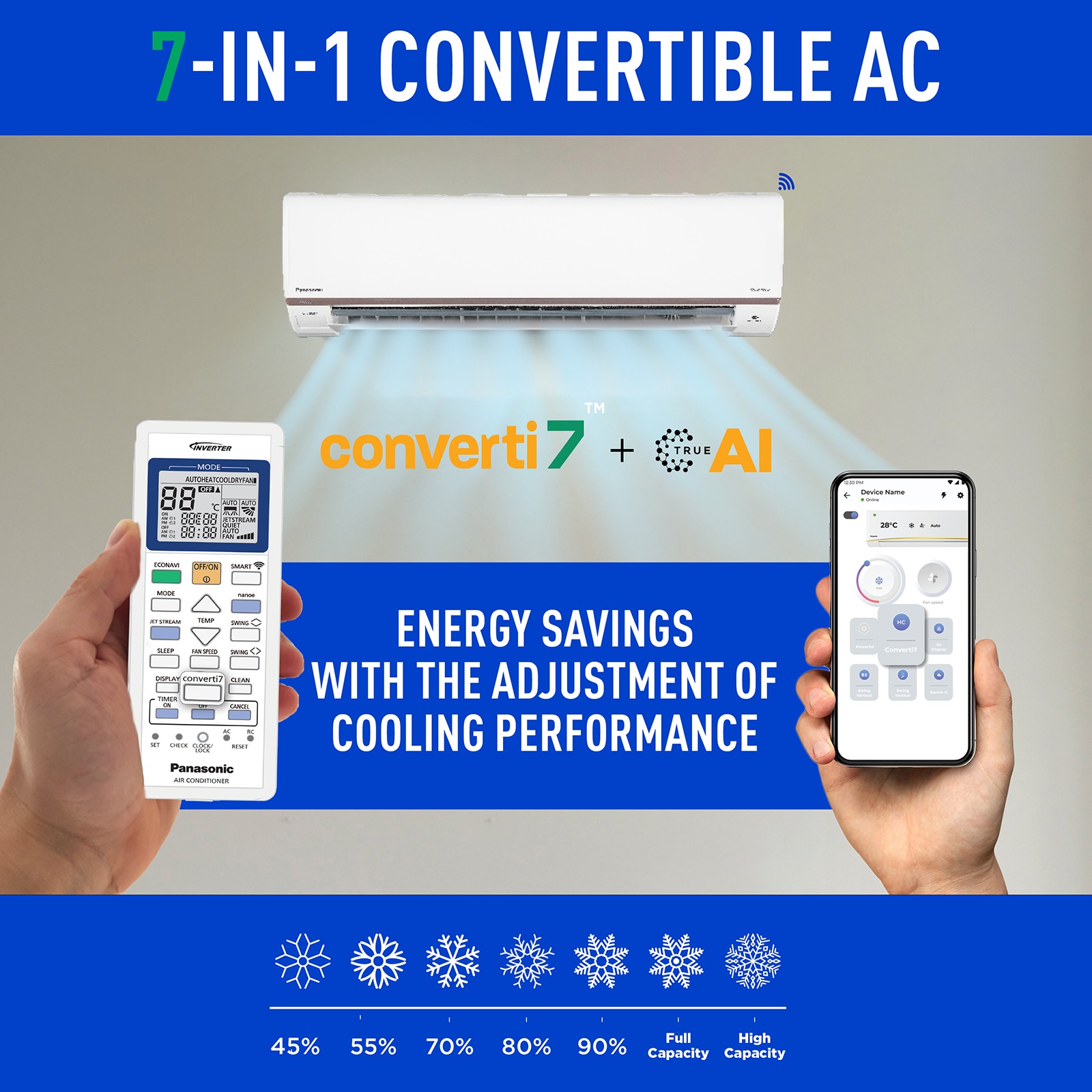 While Panasonic Inverter Air Conditioners are truly auto convertible, there is a provision to manually adjust the AC for up to 7 stages of cooling performance ranging from 45% to more than 100%, this can be done via Converti7 button on the remote or on the Miraie app