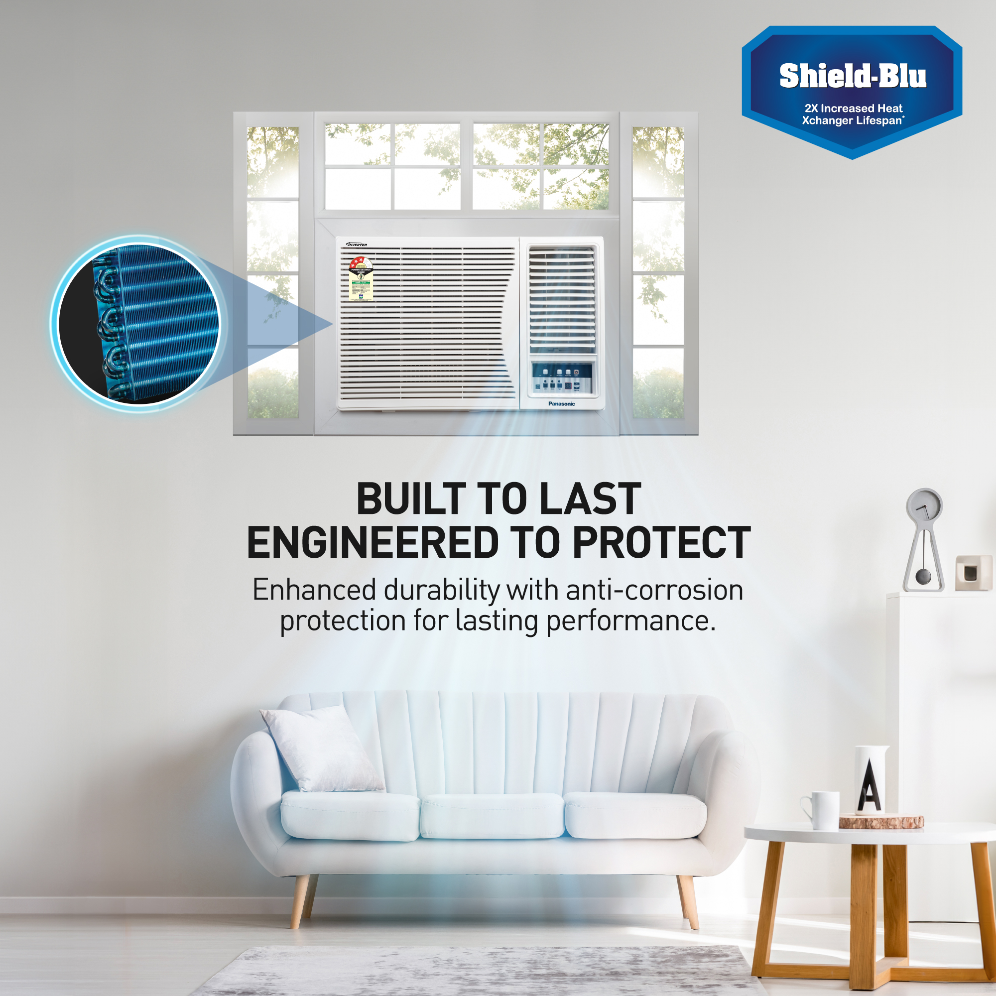 Panasonic air conditioners come with "Shield Blu" technology, an extra anti-corrosive coating on the evaporator. This preventive anti-leak coating on the copper U-bends enhances durability and contributes to a longer lifespan of the heat exchanger. These advanced features ensure long-lasting durability and reliable performance, allowing you to enjoy efficient cooling over time.