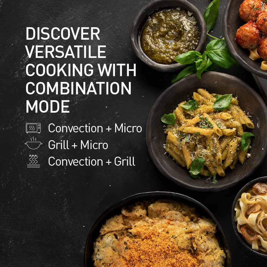 Discover versatile cooking with combination mode. Uses microwave + grill/convection for faster cooking, crispy textures, and juicy interiors—perfect for baking, roasting, and grilling!