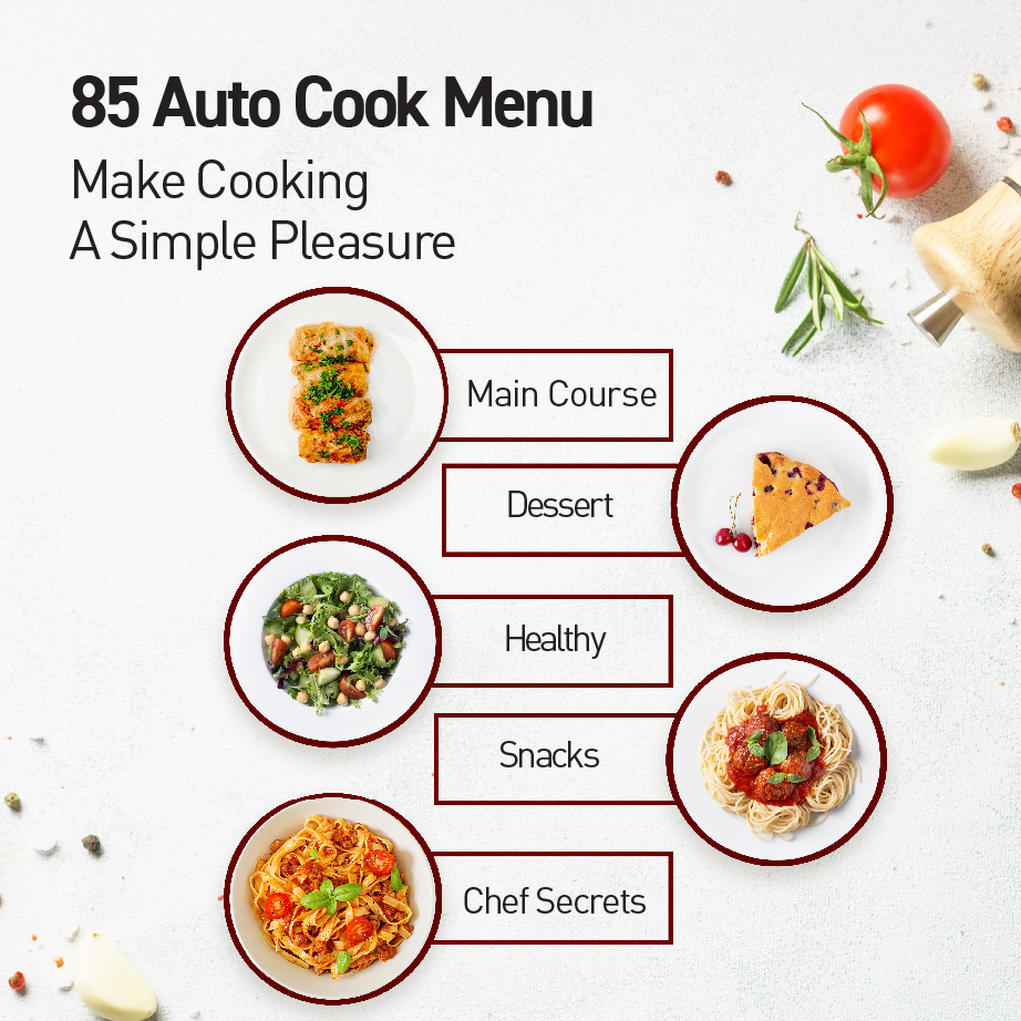- Auto Cook Menus : Choose from 85 auto cook menus ranging from healthy recipes to desserts