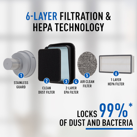 The 6-layer filtration system captures even the finest dust. The Stainless Steel Guard's oblique hole reverses the airflow and prevents dust from entering the unit.