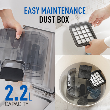 With an easy-to-detach dust compartment, you can empty it without any mess. Additionally, both the dust box and filters are washable, ensuring effortless cleanliness.